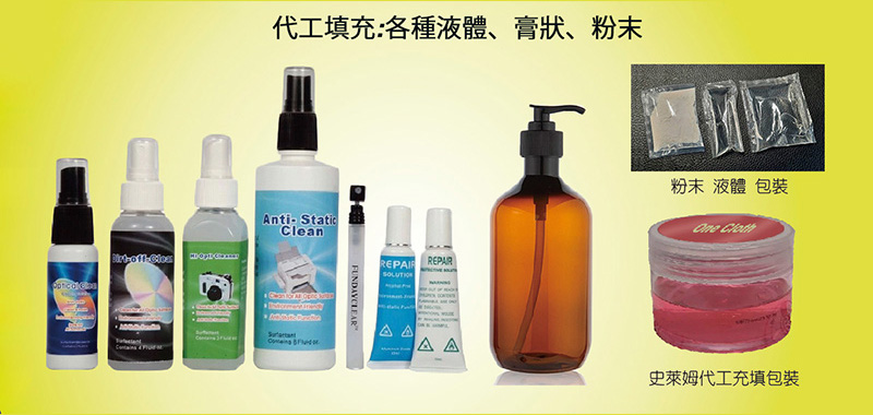 代工填充:各種液體、膏狀、粉末 例如:洗碗精瓶罐充填、抗菌液液體裝瓶填充、汽車清潔液代代瓶裝充填、史萊姆膏狀罐裝填充、蘇打粉粉末塑膠包裝充填及洗衣粉粉末瓶罐充填包裝代工。